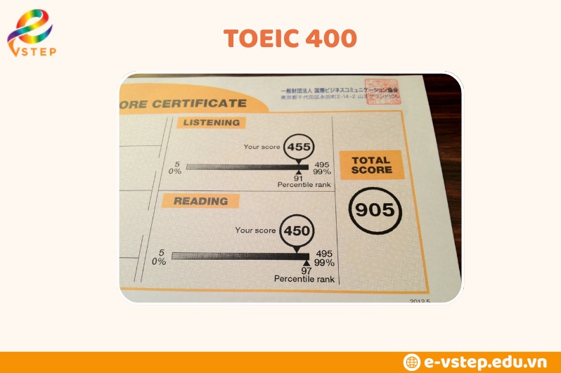 Tóm lại, TOEIC 400 cho thấy bạn đã vượt qua mức sơ cấp, đủ tự tin trong các tình huống giao tiếp cơ bản, nhưng vẫn cần luyện tập thêm để đạt các trình độ cao hơn như TOEIC 500–600, IELTS 4.5–5.0 hoặc VSTEP B1.